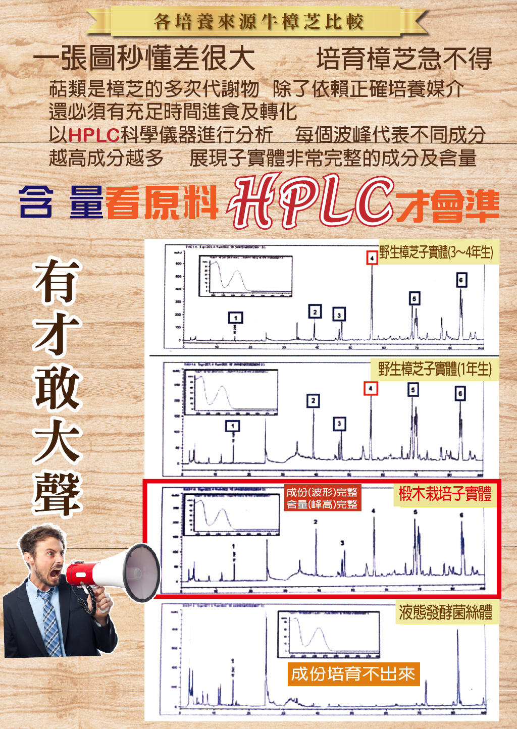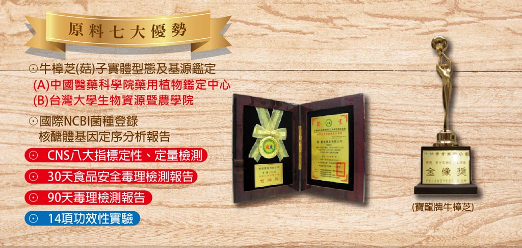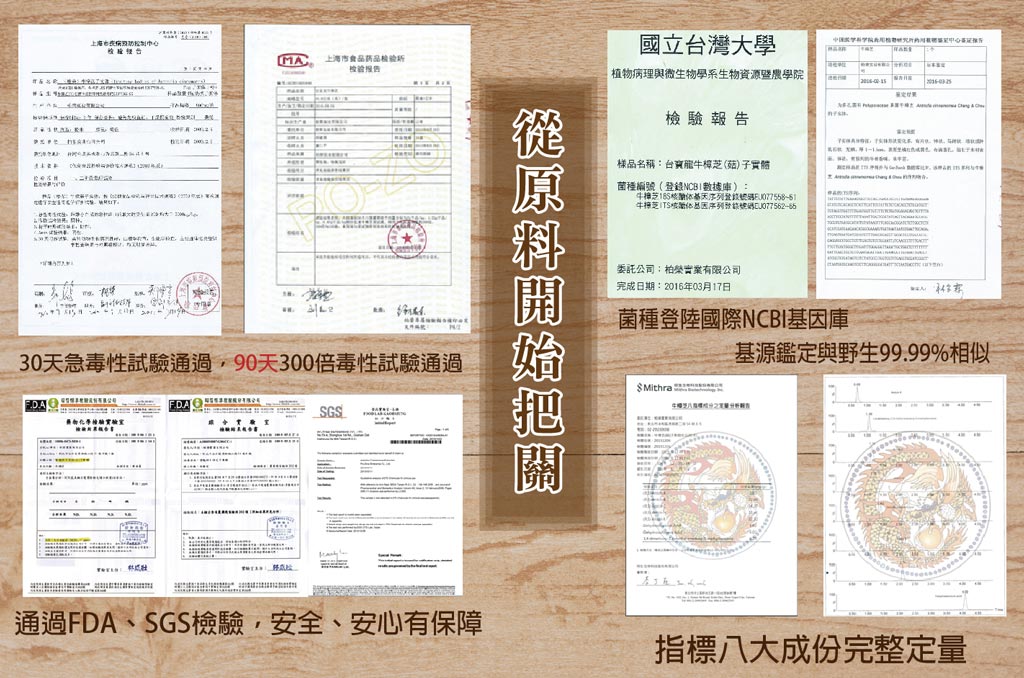 | 八大成分是市售液態、固態栽培及菌絲體的10~100倍 濕、乾菇皆有,另有不同重量販售, 請電洽0931-763968 蔡先生 ---原料優勢--- 榮獲國家品質金像獎、金牌獎 工研院、生技中心合作 14項功效試驗 日本健康食品雜誌、商業週刊、康健雜誌、早安健康報導 經國際NCBI生物基因庫登錄 中國醫學科學院、台大農學院 完整中草藥/天然物基源鑑定 CNS國家標準局 牛樟芝指標成份完整定性定量 衛服部食藥署備查通過 30、90日毒性試驗通過 FDA、SGS重金屬、農藥、黃樟素等多項檢驗通過 最高規格的品質,為您帶來最高品質的健康 |